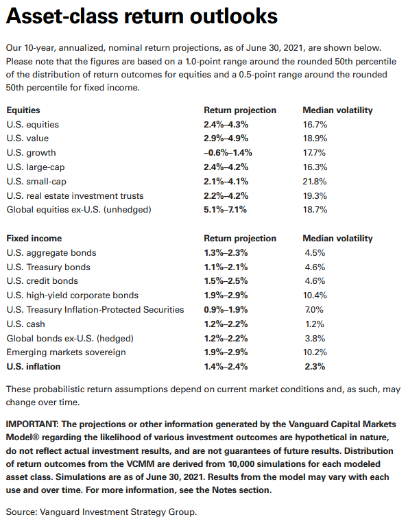 I would also argue that the graphic doesn’t fully convey today’s market environment as generating a 7.5% return today will be difficult without taking some very high levels of risk. Based on the below table of 10-year return projections from Vanguard, I estimate that a more reasonable rate of return is 3-4%.